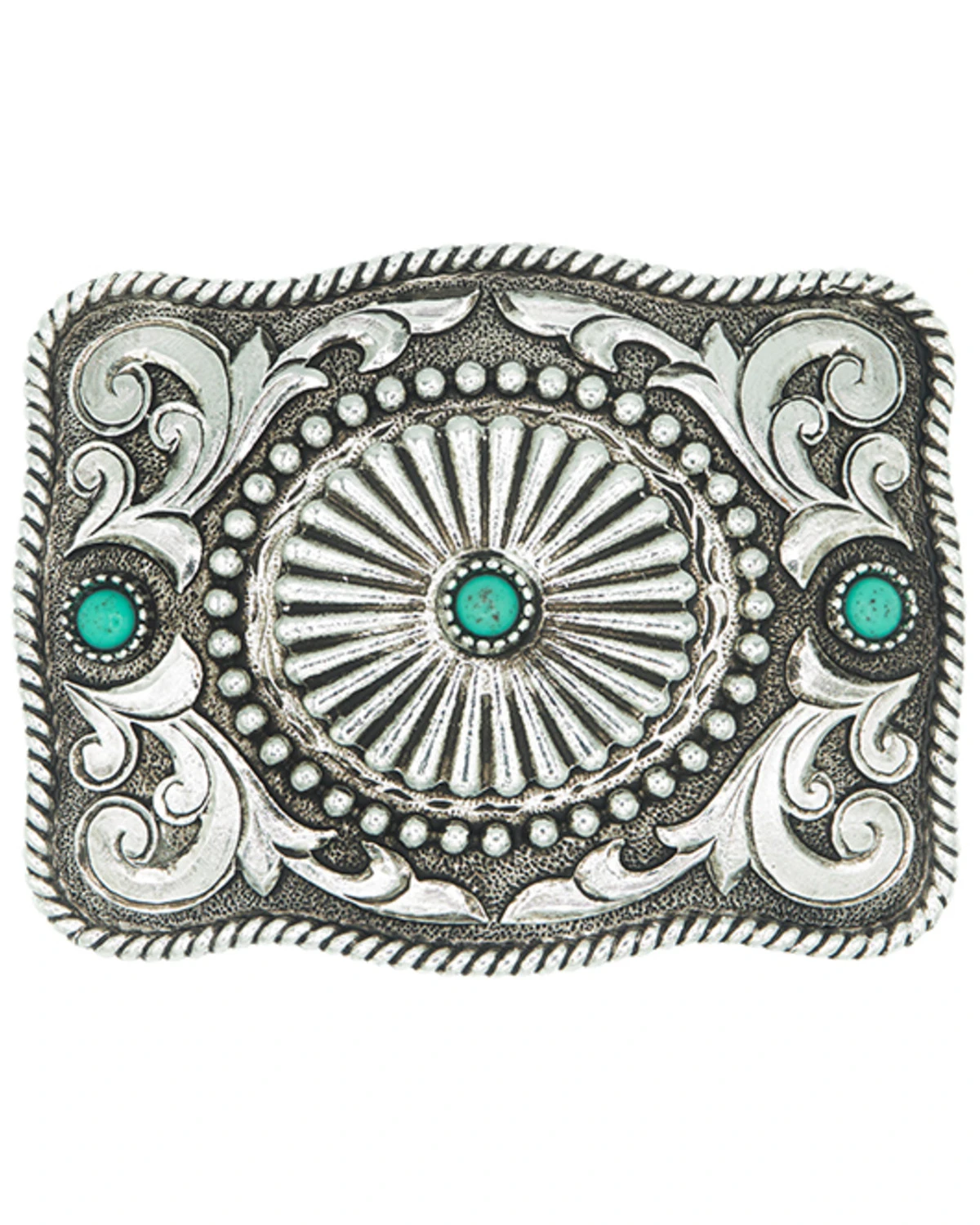 - Etched concho detail with stationed beads and turquoise inlay